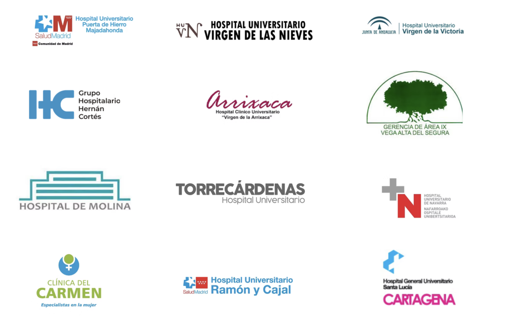 Hospital Universitario Virgen de las Nieves (Granada), Hospital Universitario de Navarra (Pamplona), Hospital Universitario Torrecárdenas (Almería), Hospital Universitario Puerta de Hierro (Madrid), Clínica del Carmen (Las Palmas de Gran Canaria), Hospital de la Vega Lorenzo Guirao (Murcia), Hospital Universitario Virgen de la Arrixaca (Murcia), Hospital Universitario Ramón y Cajal (Madrid), Grupo Hospitalario Hernán Cortés (Zaragoza), Hospital General Universitario Santa Lucía (Cartagena) y Hospital Universitario Virgen de la Victoria (Málaga)